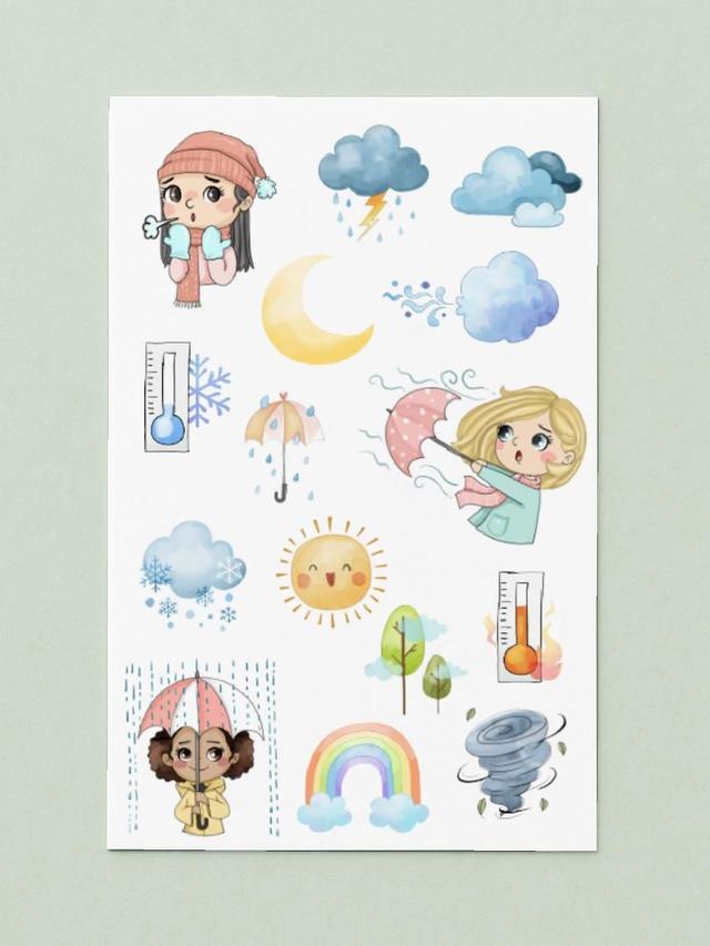 Maak van elke weersvoorspelling een feestje met dit schattige stickervel. Of het nu regent of de zon schijnt, de vrolijke illustraties van Rozeka geven je planner altijd een zonnig sfeertje.